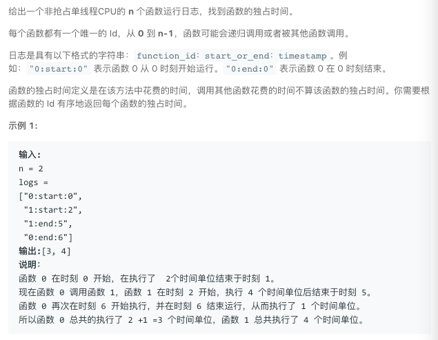 函数按照时间顺序执行就是一个调用栈的结构,因此这是一道简单运用栈按照题目说明进行模拟函数调用的题目,主要的坑在于花费时间的计算,看清题意